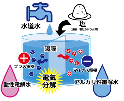 水道水に微量の塩を添加して電解槽にて電気分解し、発生したイオンを特殊な膜を使用して分離。
